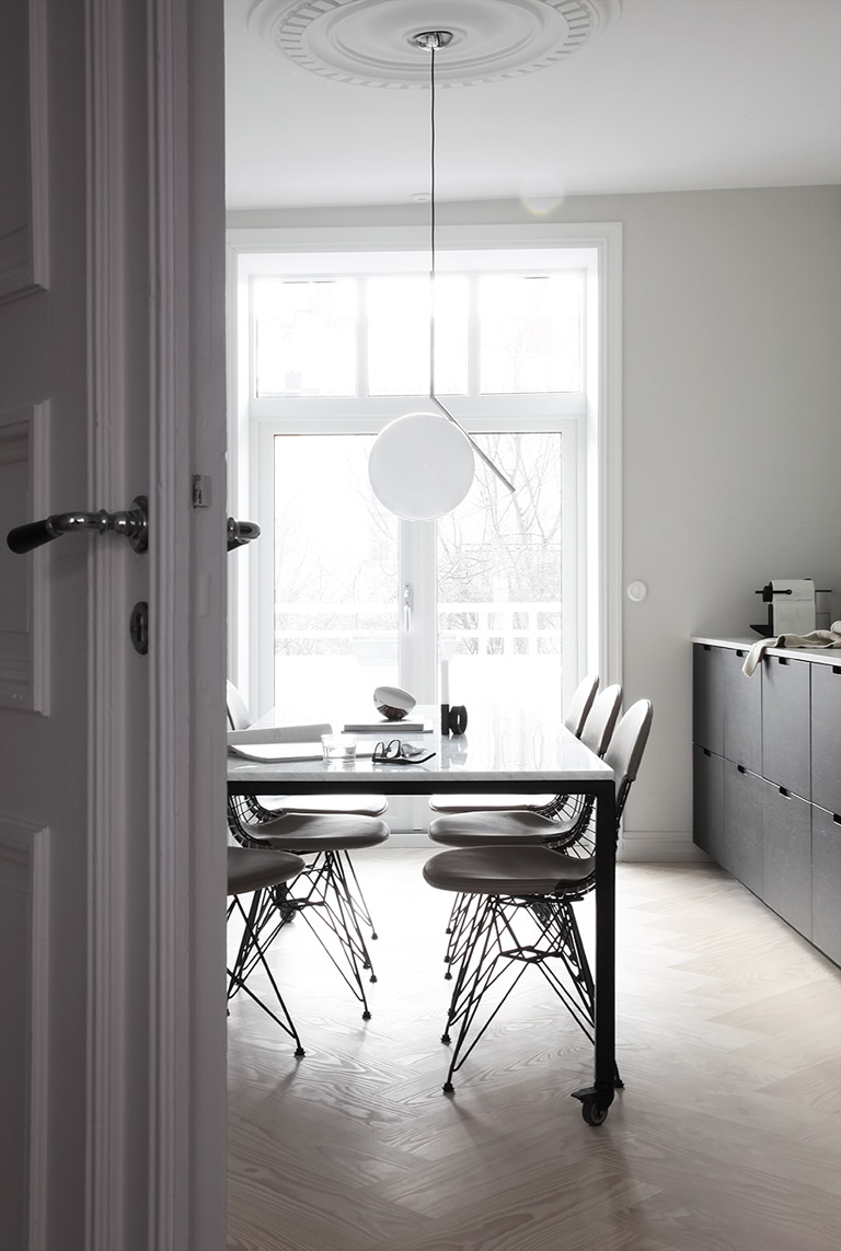 Efter att ha upptäckt att nästan inga av de ursprungliga detaljerna fanns kvar, bestämde jag mig för att återskapa en del av dem. Min önskan var att det skulle se ut som en moderniserad lägenhet från 1896. I stället för de typiska, gamla fiskbensgolven, valde jag ett golv från Dinesen i en större dimension. Eftersom jag inte hade sett ett bra exempel på golvet jag hade beställt, var jag så spänd på att se hur det skulle bli i verkligheten. Men, jag kunde inte vara mer nöjd med mitt val. Golvet behandlades med lut och vit olja, och med tiden (och rengöring) kommer det ljusna ännu lite till.
