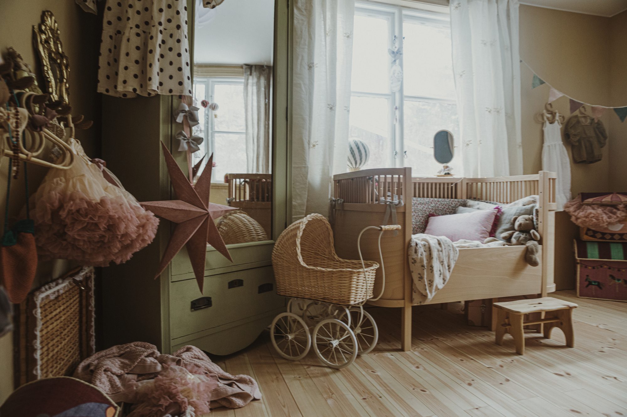 Drömlikt barnrum. Här trivs Angelica och Toms dotter Lova! Sovrummet är målat med LADY Minerals kalkfärg i 1392 Gul Antik.