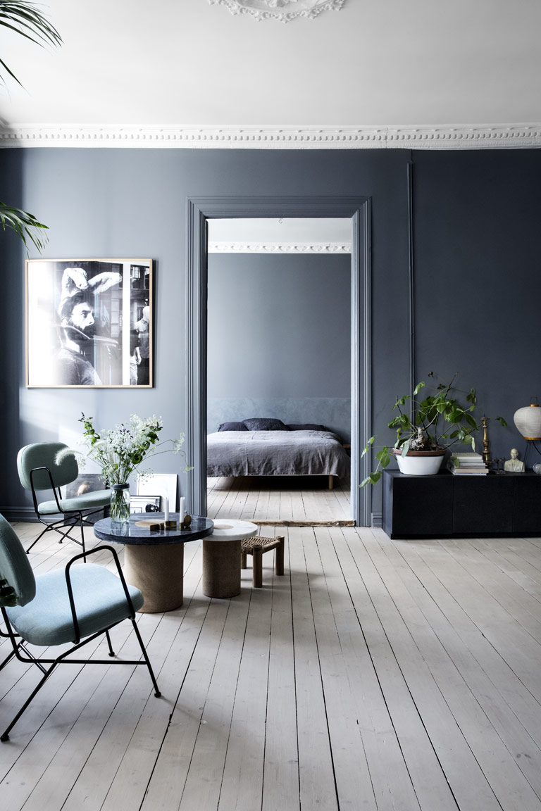 Med Jotun-färgen 4629 Skuggblå, har Kråkvik och D’Orazio fått en harmonisk, omfamnande färg i sin nyrenoverade lägenhet.