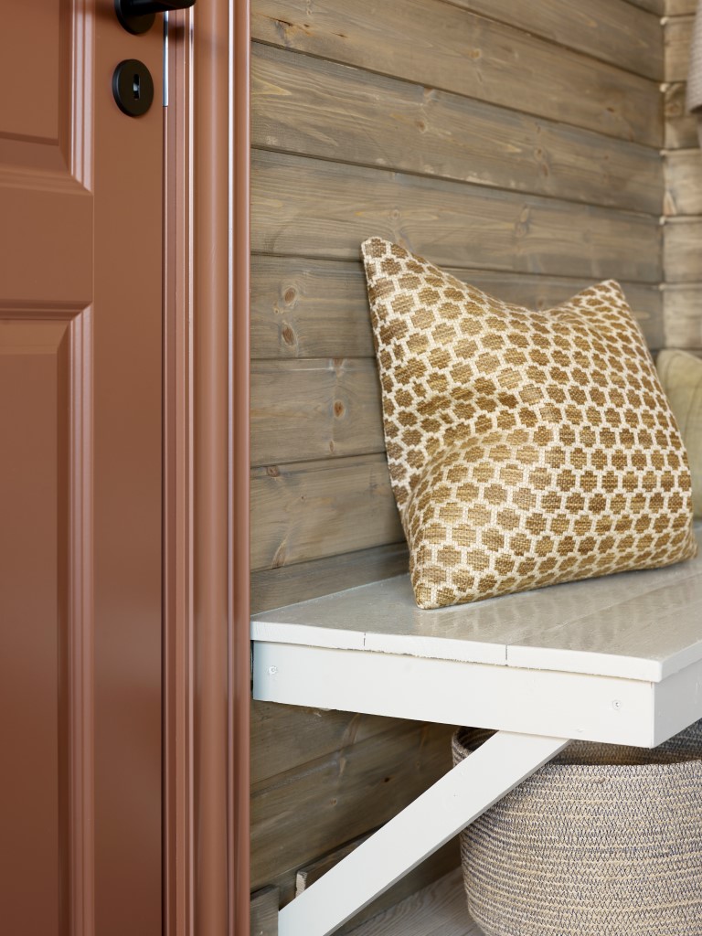 Väggarna är laserade med LADY Pure Nature 9043 Sjösand, en strykning. Dörren är målad med LADY Supreme Finish Halvblank 20144 Grounded Red. Bänken är målad med LADY Supreme Finish Halvblank 12076 Modern Beige.